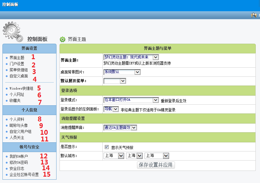 【个人事务】-【控制面板】包括界面主题、个人资料、我的帐户等15个功能。
