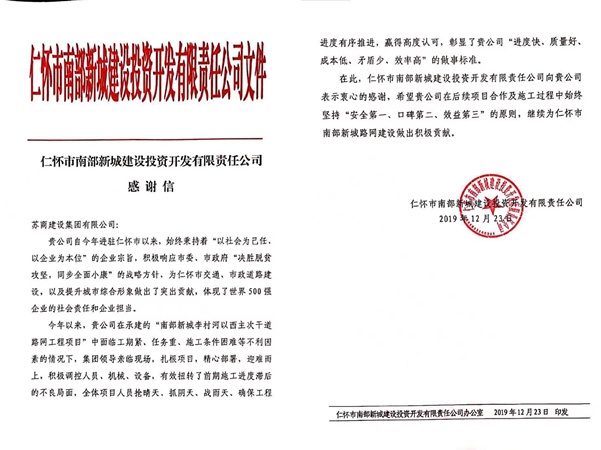 12月23日,苏商第十五建设集团收到贵州省仁怀市南部新城建设投资开发有限责任公司发来的感谢信,信中对日本三级片