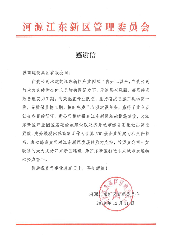 苏商第六建设集团收到广东河源江东新区管委会感谢信