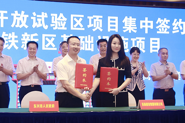 与东兴试验区签订的东兴高铁新区基础设施项目拟建高铁站前广场,长湖路罗浮江大桥,锦绣路,低丘缓坡纬五路、六路,冲揽工业园园区道路,标准厂房等,占地面积约1300亩,投资规模不少于100亿元。项目的成功落地,将为东兴国家重点开发开放试验区加快推进高质量产业建设、高层次对外开放提供坚实支撑。