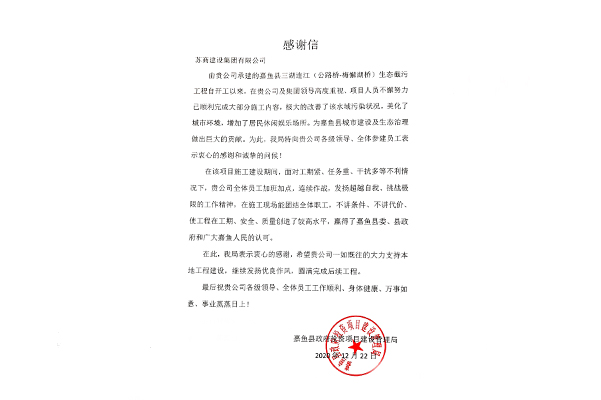 苏商建设第十集团收到湖北省嘉鱼县政府投资项目建设管理局感谢信