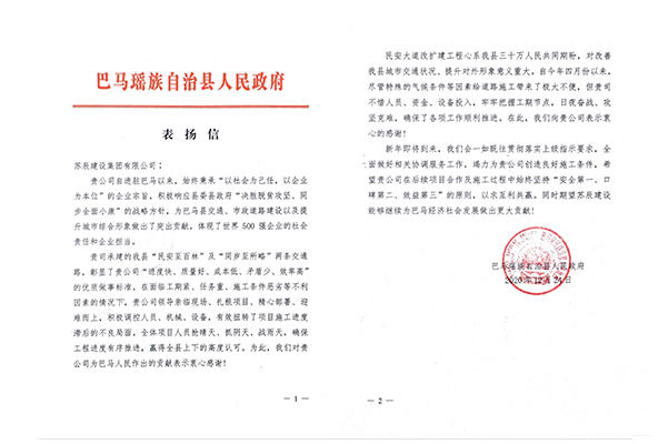 12月24日,苏商建设第七集团收到来自广西河池市巴马县政府的表扬信,对集团在民安至百林公路项目、同岁至所略公路项目及民安大道项目建设上作出的贡献致以感谢。信中提到,日本三级片 自进驻巴马以来,积极响应县委、县政府“决胜脱贫攻坚、同步全面小康”的战略方针,在助力巴马县交通、市政道路建设以及提升城市综合形象等方面作出了突出贡献,充分彰显名企的责任担当。(文/图 苏商建设第七集团文品中心)